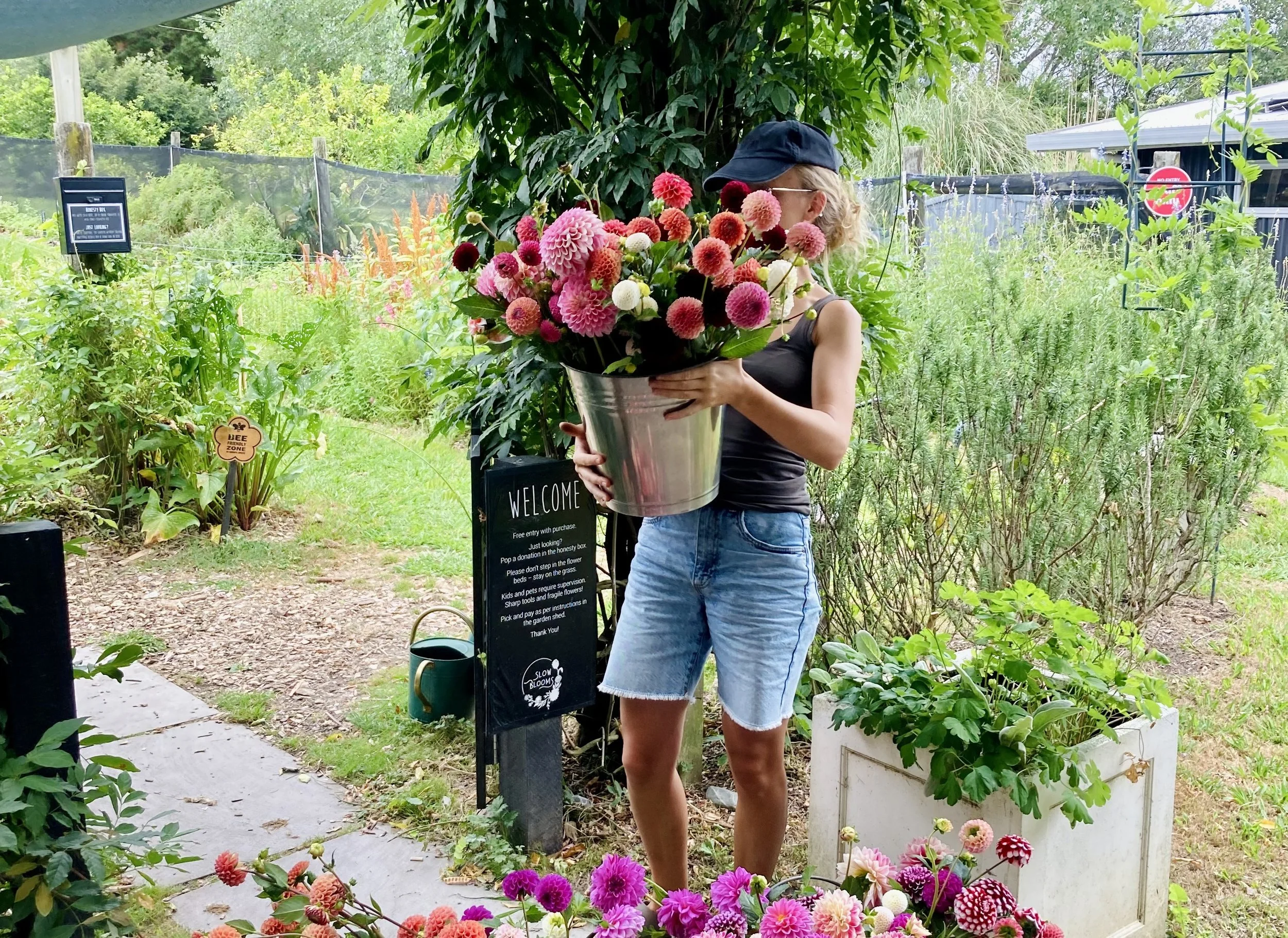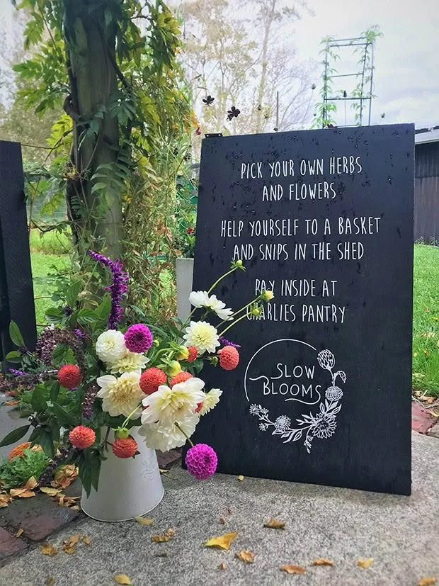 Guests can borrow a basket or bucket and a pair of snips from the shed and choose their blooms at their own pace while leisurely strolling through the garden. Slow Blooms is rooted in sustainability and seasonality. Every bouquet reflects what is growing seasonally at the time. After selecting, just return the gear, weigh your flowers, and pay at the shed (or inside the adjacent gelato shop, Charlies).